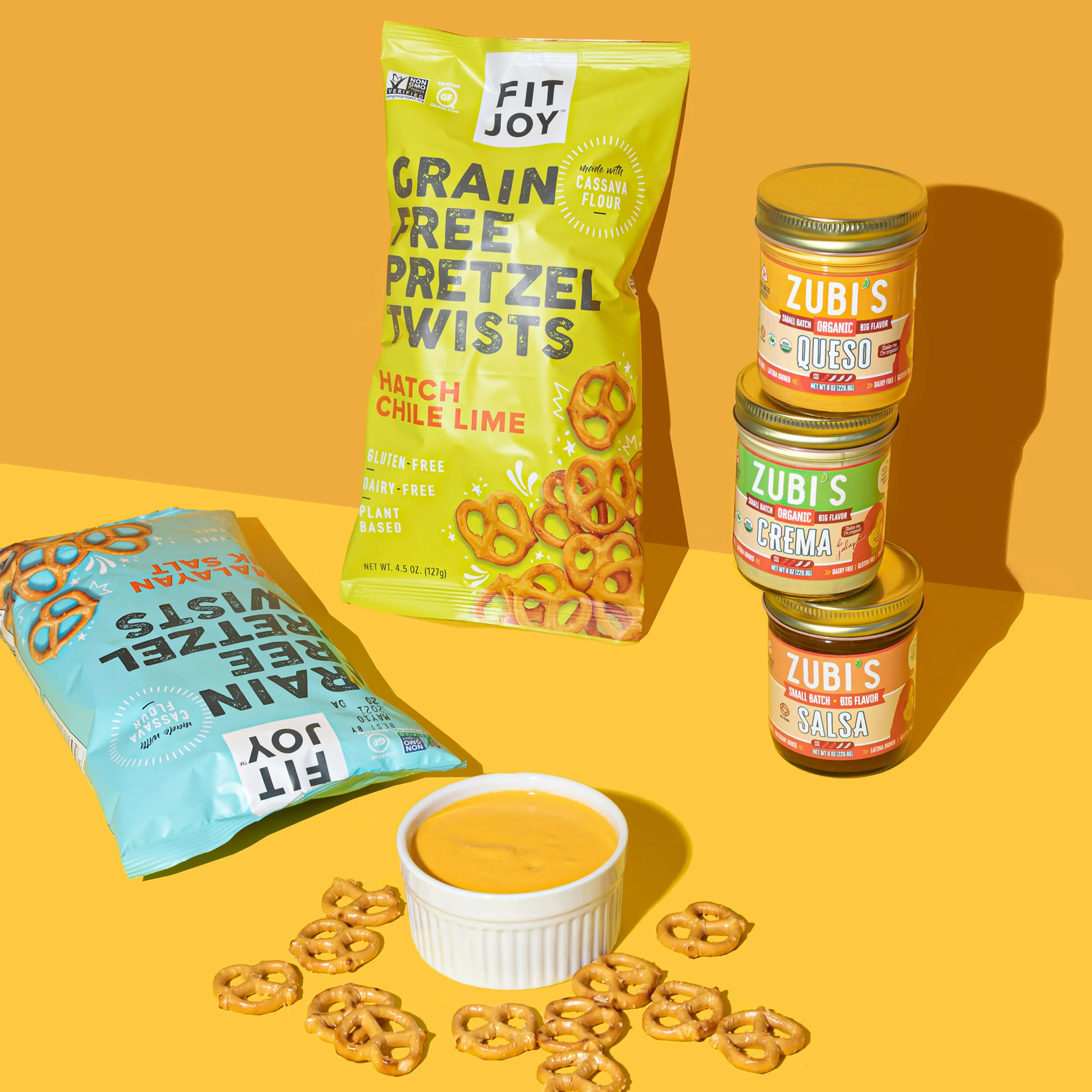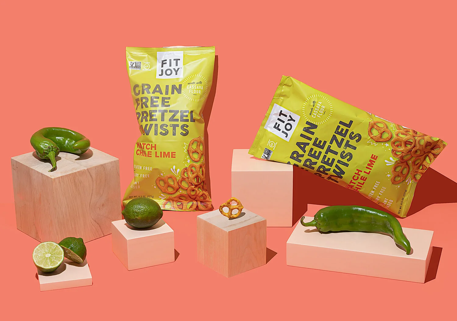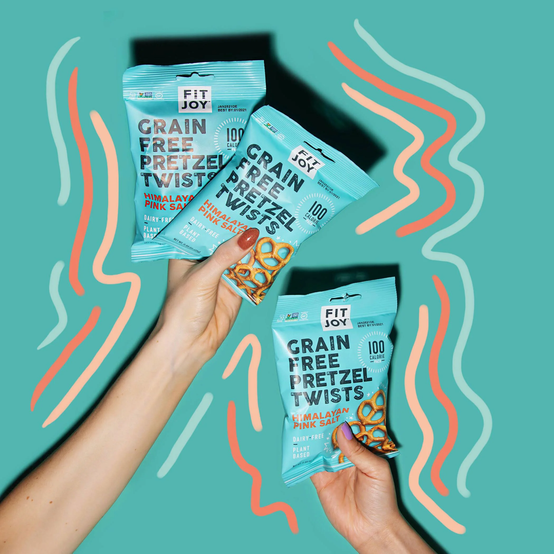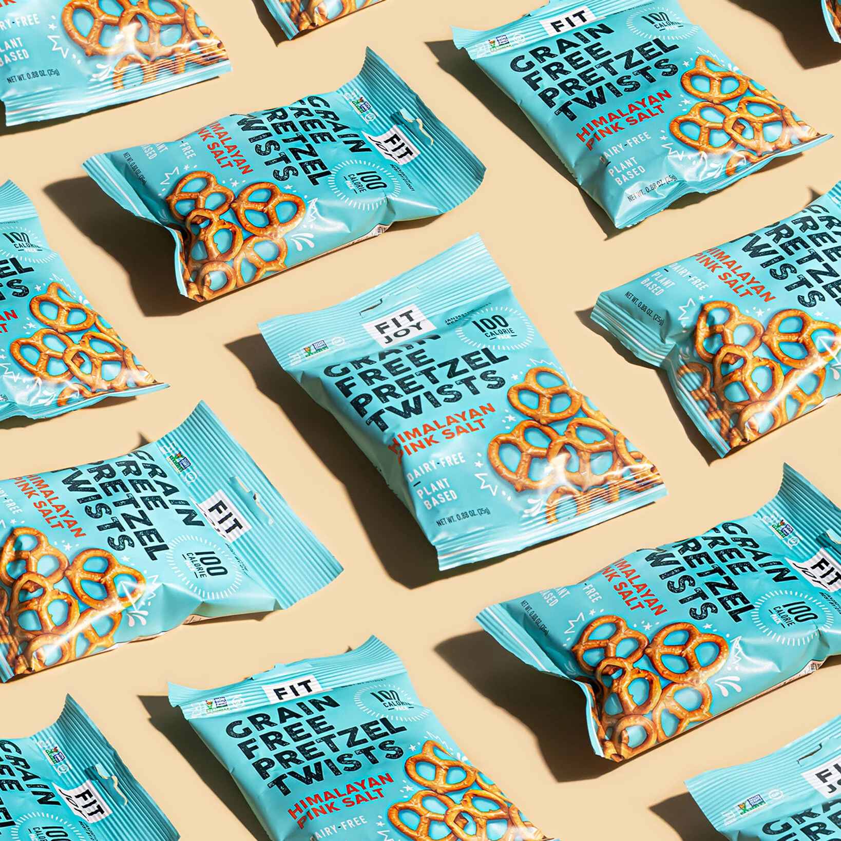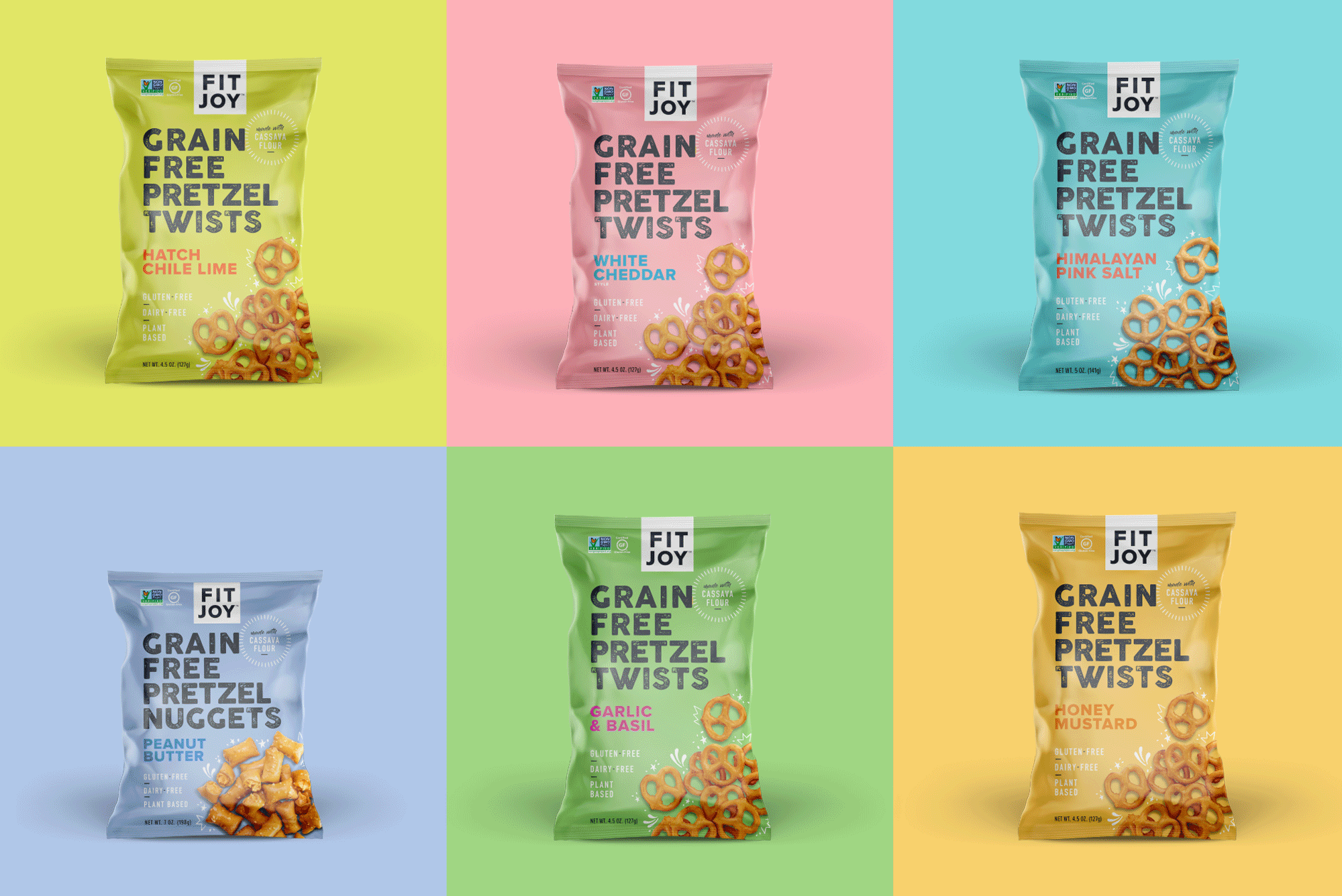 FitJoy recently launched several new flavors of their grain-free pretzels and hired us to design the packaging. We wanted to use vibrant, joyful colors that would stand out against the darker browns and greens that tend to dominate the pretzel aisle. Cheerful pastels foreground the fun new flavors, while clean text and a matte finish speak to a gourmet product with a simple, natural ingredients list.